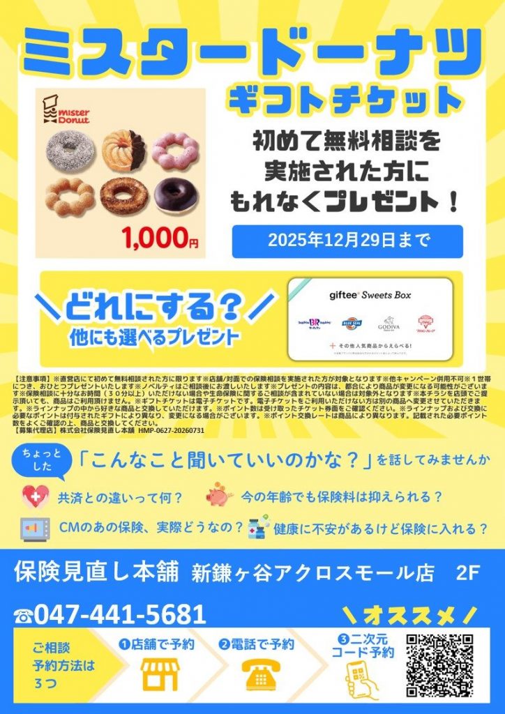 こんにちは!保険見直し本舗新鎌ヶ谷アクロスモール店です★ご好評につき12/29(月)までの期間限定で