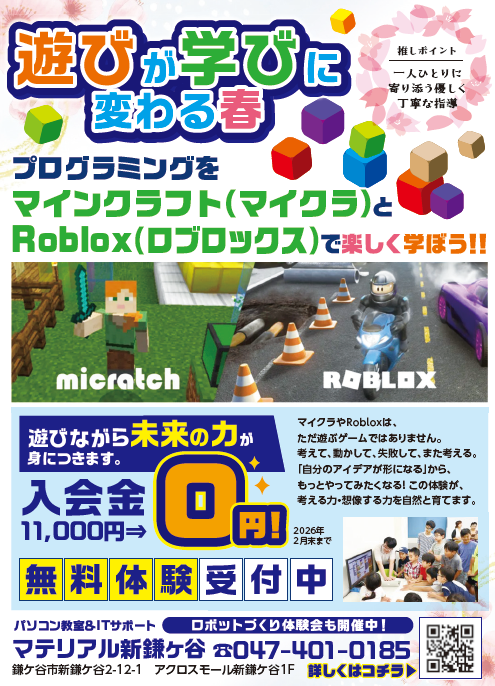 ◎パソコン教室マテリアルからのお知らせです!2月末まで学生プログラミング授業の入会金が無料になるキャンペーンを実施中です!